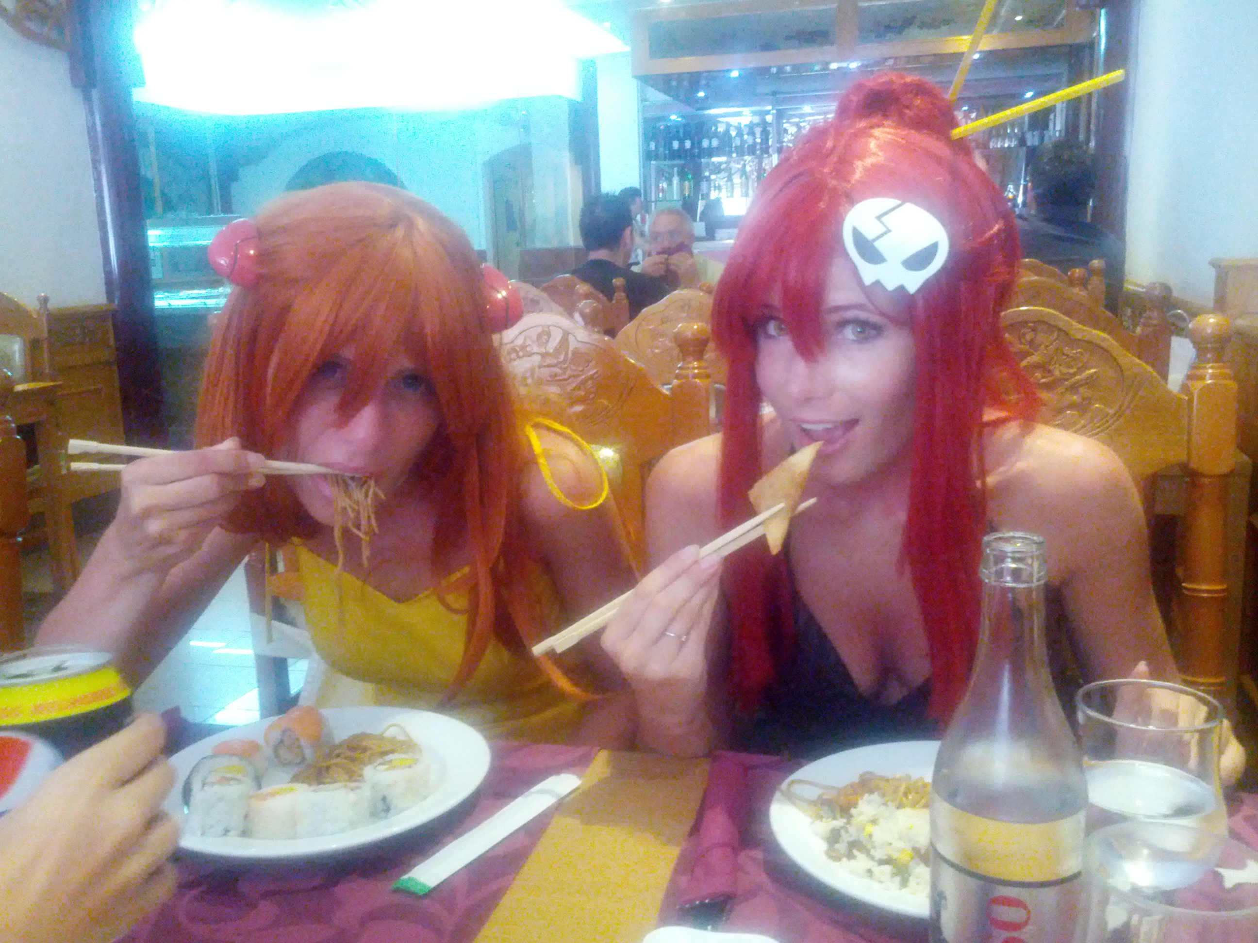 Per il pranzo siamo andati a quello che da noi chiamiamo Sushi Wok: cibo cinese e giappo a buffet con prezzo fisso. Ecco, avevo anche coperto le “nudità” di Yoko indossando una canotta e gonna, ma la gente ci ha guardato malissimo lo stesso che lol! Tanto è un classico anche se eravamo a nemmeno 100m dalla palestra in cui si svolgeva l’evento :S