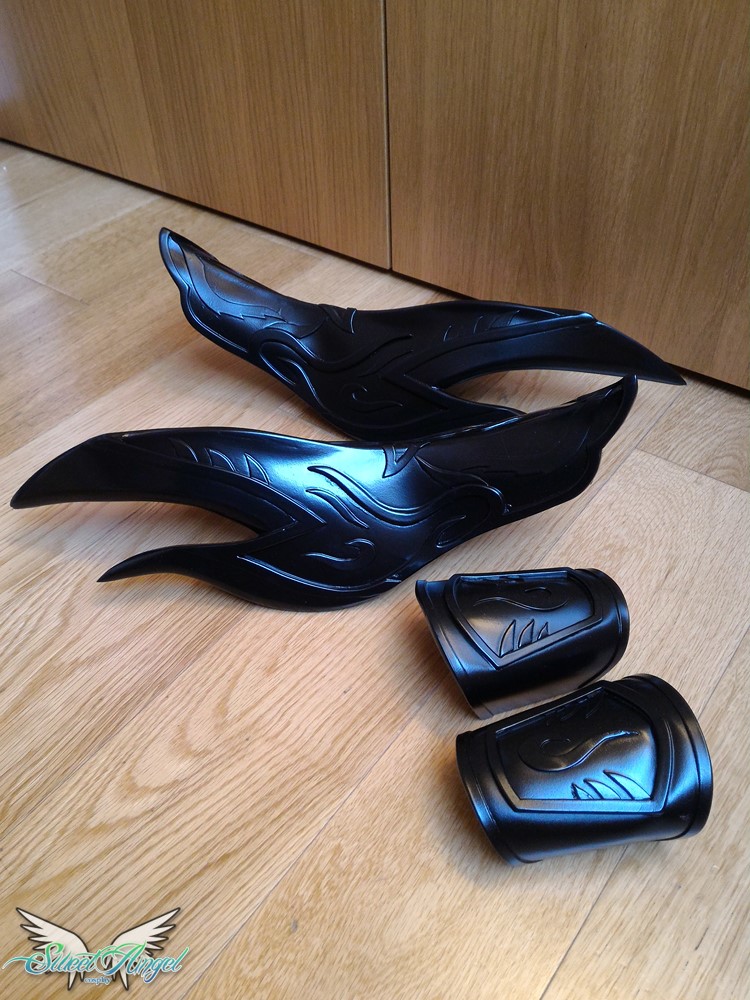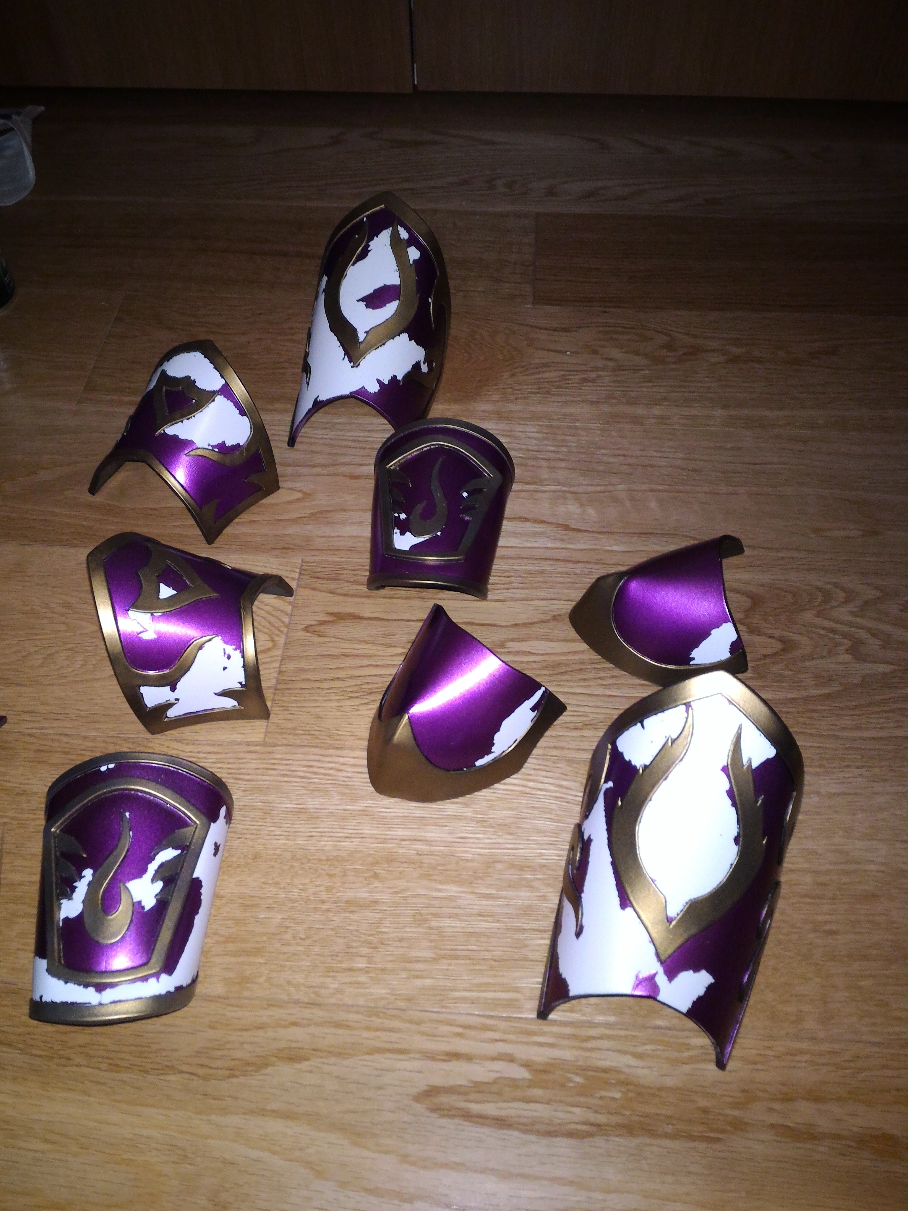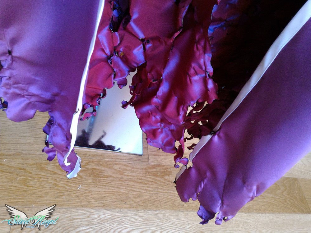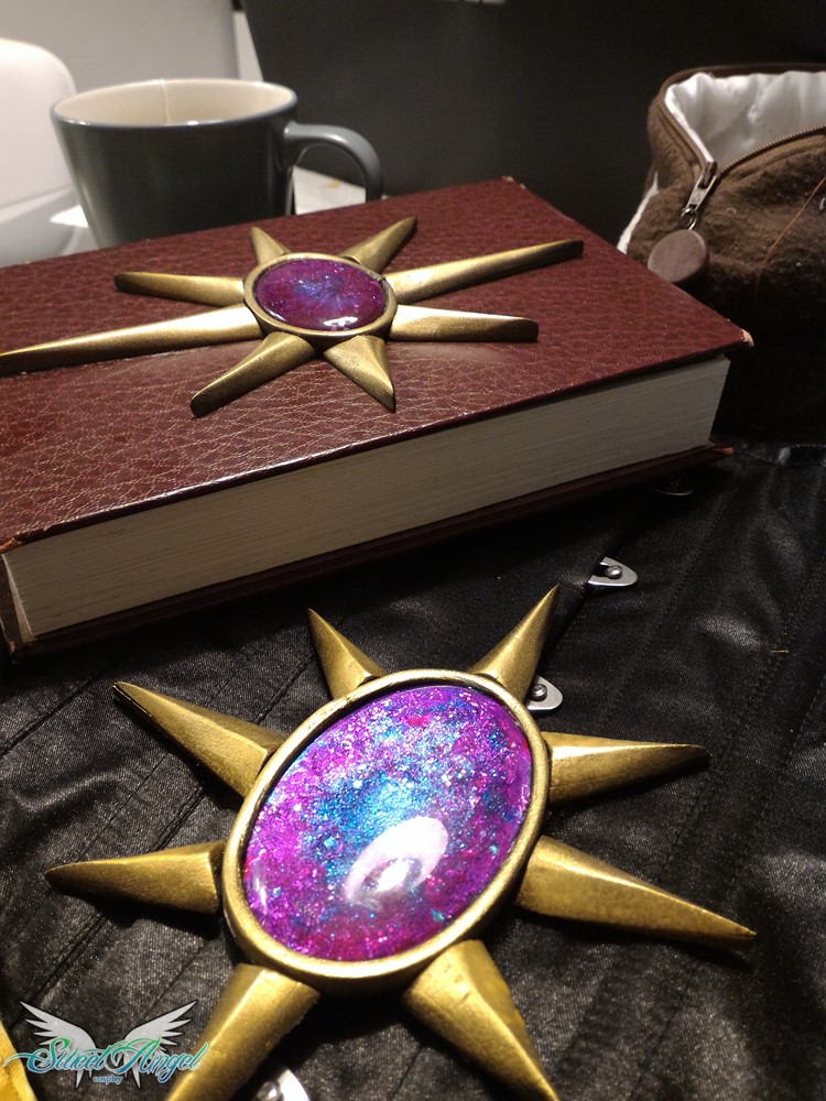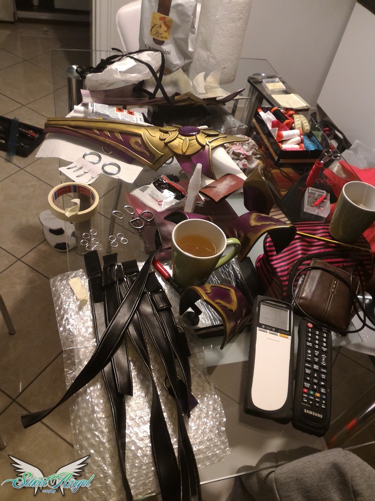 Decisione: ammazzarsi di lavoro e provare a salvare l’armatura o buttare tutto nel cestino e rifarla al ritorno da Lucca per l’evento in Spagna? Teste dure come siamo abbiamo optato per continuare. Alla fine mentre io cucivo gli ultimi pezzi, lui ha dato una colorata alla meglio che poteva all’armatura senza usare gli scotch (solo la corona era salva, l’avevo aerografata ancora giorni prima e aveva retto bene non avendo bisogno di mascherature).