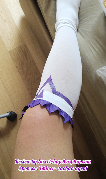 – le calze sono diverse dall’immagine di riferimento e sono talmente strette da non salire oltre al ginocchio nonostante avessi richiesto qualcosa di ben elasticizzato, conoscendo le mie “gambotte”. Ho rimediato temporaneamente tagliandole e aprendole di ben 6 cm sul retro per la parte viola. In futuro le rifarò a modo da zero.