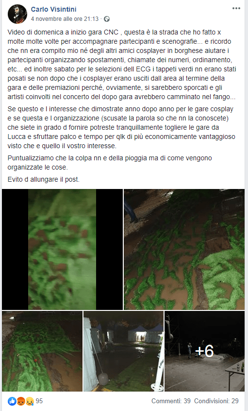Ora penserete che l’evento comics&games più importante e grande in Italia, presente da non pochi decenni nel territorio, abbia ovviamente preparato un piano B per le gare cosplay in caso di pioggia annunciata da tempo, visto che la probabilità di rovesci in un mese come novembre è più che alta. E invece no.