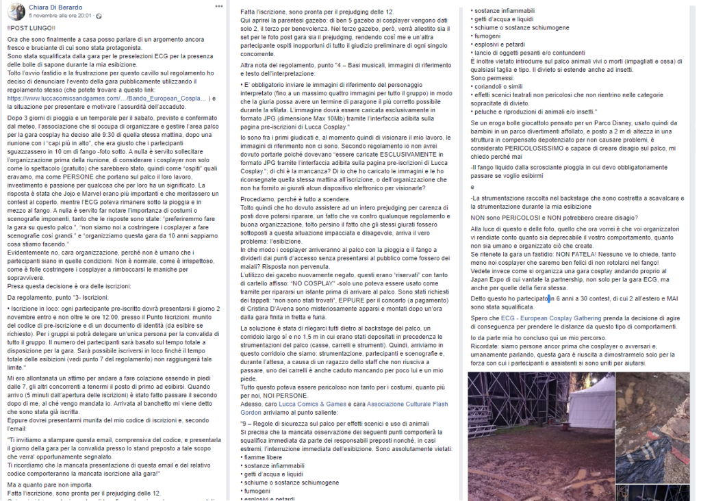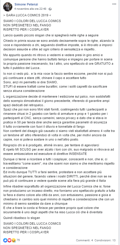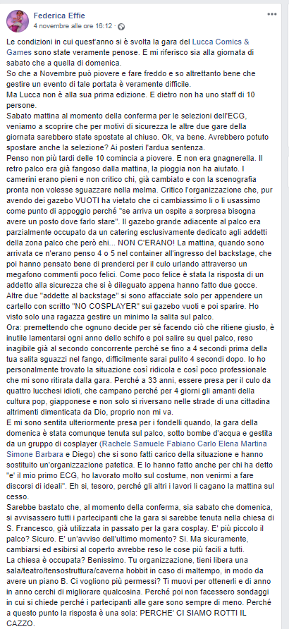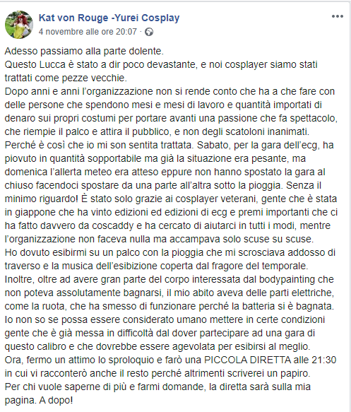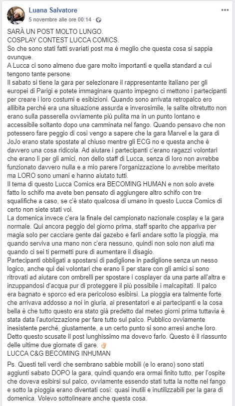 Vorremmo che l’organizzazione del “Lucca Comics and Games” prendesse in considerazione l’idea di spostare in uno spazio coperto e pavimentato TUTTI i contest presenti all’interno della kermesse, permettendo così a pubblico e cosplayer di poter vivere in serenità un momento tanto atteso durante l’anno. O nell’impossibilità di riservare uno spazio coperto a questi eventi, di attrezzarsi con pedane e gazebo RISERVATI AI COSPLAYER nel backstage del palco principale