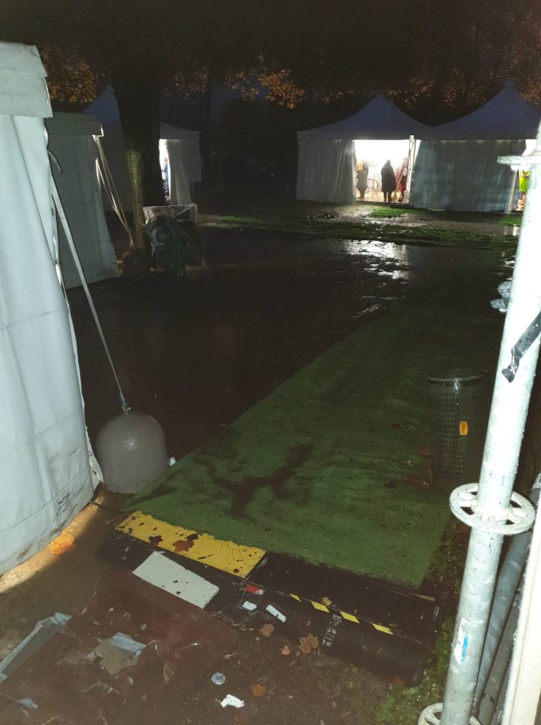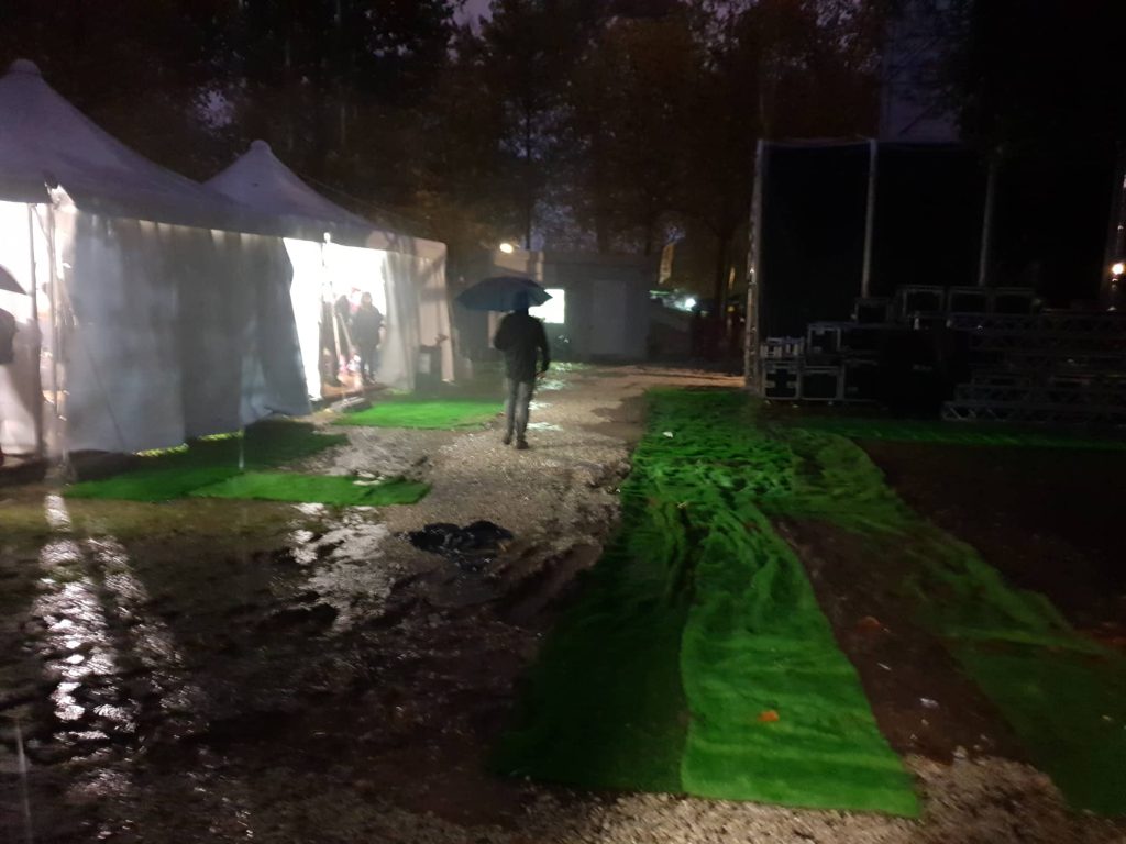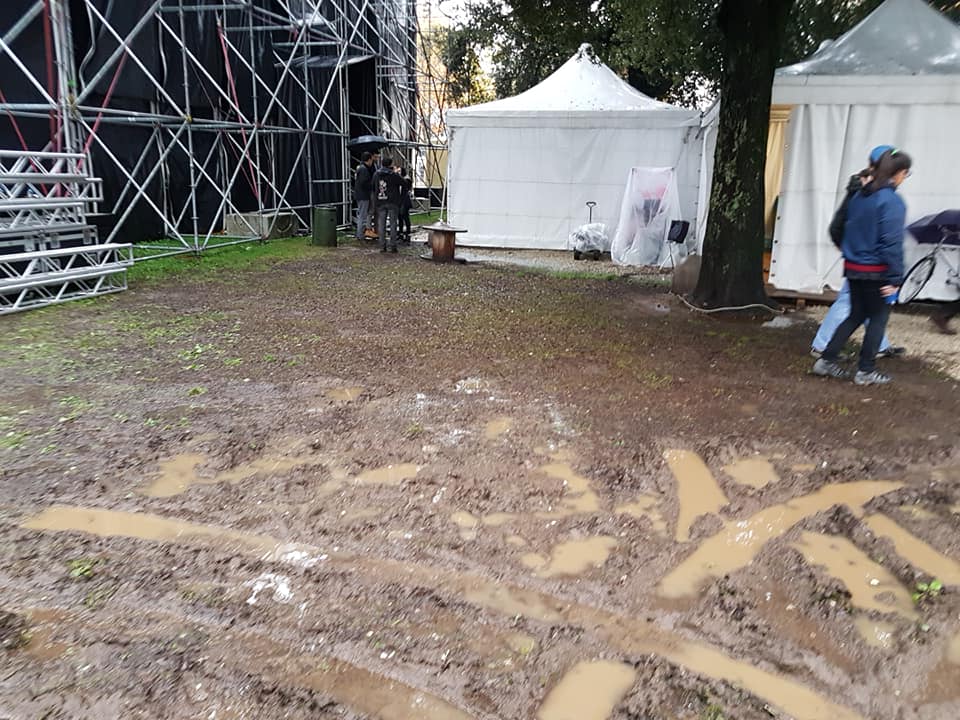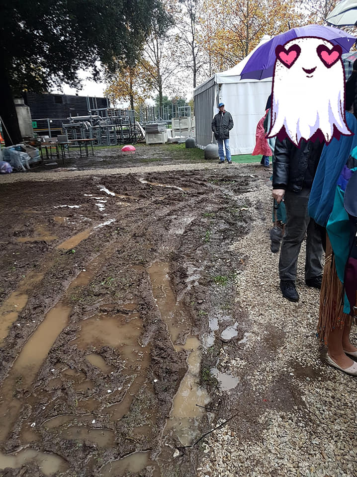 E’ venuta giù acqua, tanta acqua. Si è formato fango, tanto fango. La situazione dietro il mega palco di Lucca Comics era così. Ovunque si si sprofondava e ci si sporcava. Avete presente quei bei vestiti con strascico, scarpe elaborate, tacchi sottili, armature con difficile mobilità anche su asfalto? Colorateli di marrone con l’immaginazione.