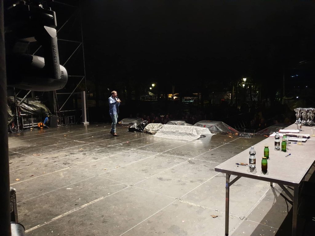 ci siamo cambiati stretti-stretti nei gazebo iniziali, e poi ci hanno fatto aspettare sotto la pioggia il nostro turno per salire al palco.