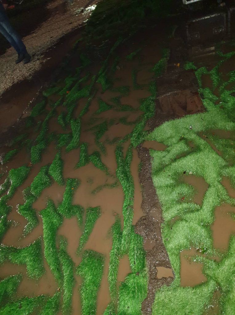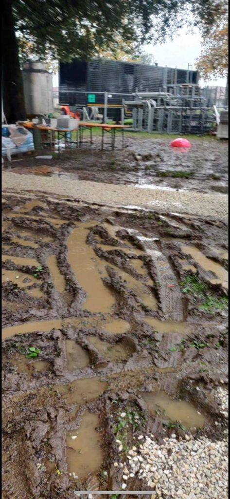 Domenica, per le successive gare, quegli stessi tappeti erano ormai talmente zuppi che appoggiando il piede si sprofondava e schizzava fango ovunque. Ecco a voi: