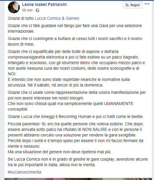 E’ da davvero tanto tempo che non faccio un articolo polemico in questo blog, anzi forse non ne ho mai fatti di veri e propri perché questo luogo virtuale è nato per narrare esperienze, eventi, tutorial a tema cosplay. Sento però il dovere di raccontarvi quanto successo nel retro palco durante le gare cosplay di Lucca Comics 2019 perché io, come le altre centinaia di persone, ci siamo sentiti trattati molto male, se non presi in giro.