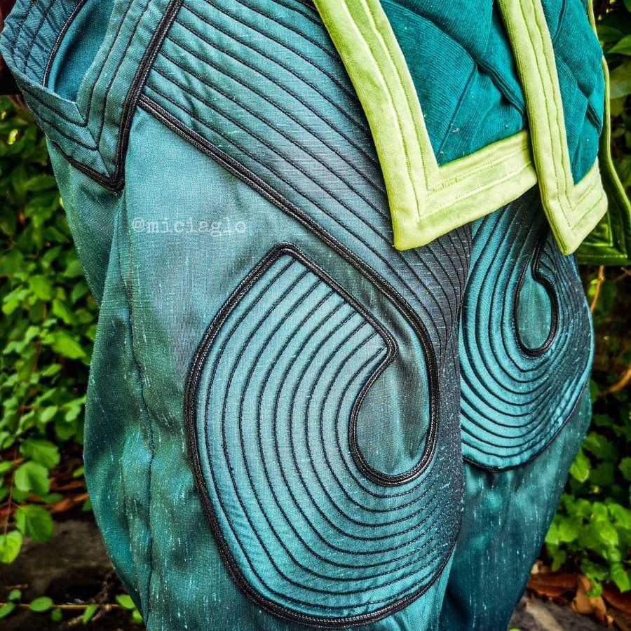 I styled the wig starting from a simple black base, adding a ponytail and setting everything in place with spray lacquer. The outfit is mainly made of taffeta and velvet, with many embroidered details done using a basic sewing machine.