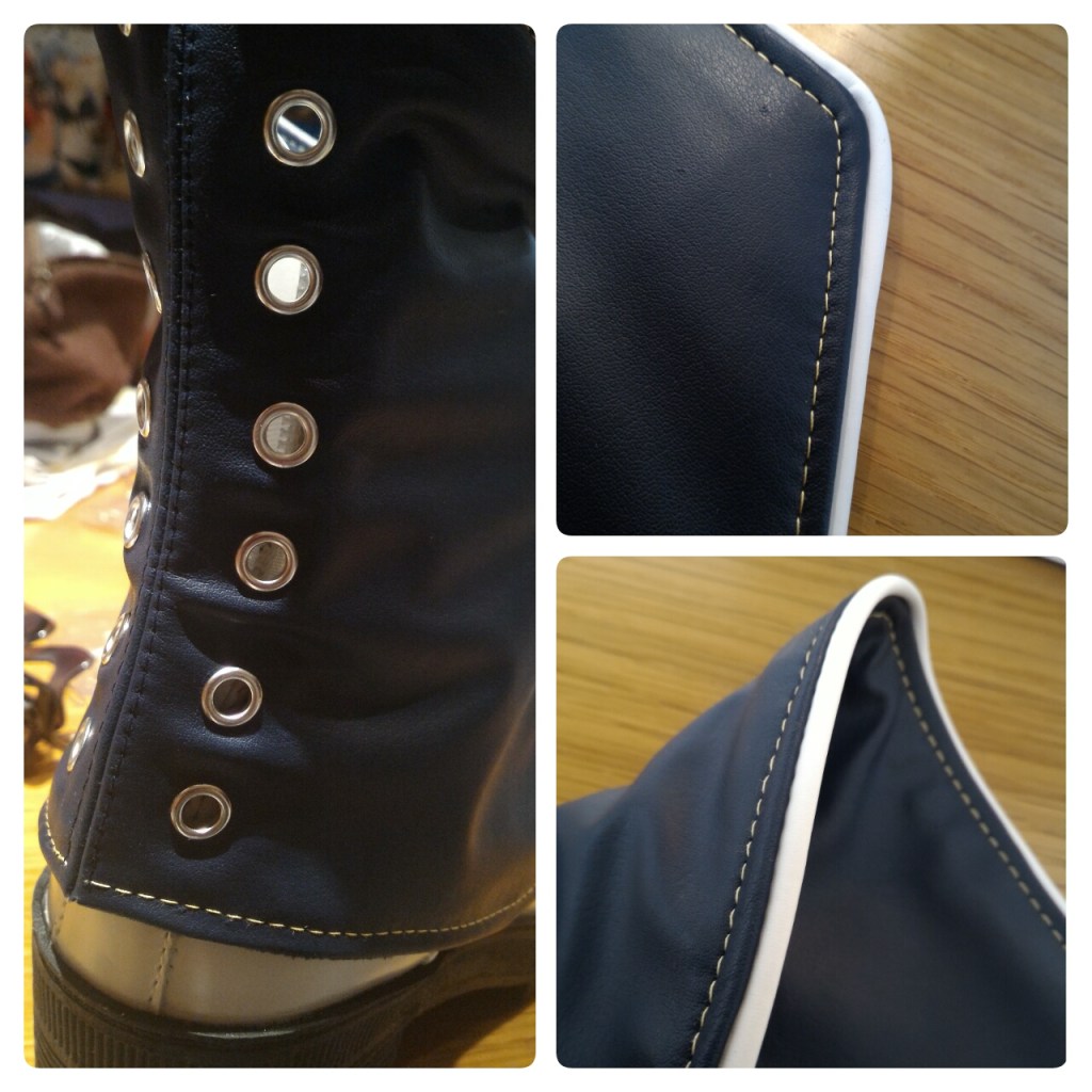The boots started from a pair of white ankle shoes, to which I added blue faux leather panels, carefully tailored and neatly finished inside and out for accuracy and durability.