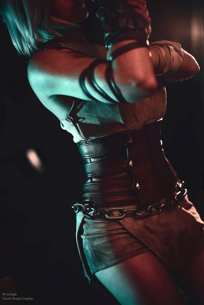 The outfit itself is sewn from slightly stretchable fabric, chosen to maintain its shape without distorting with movement. The corset is made of faux leather and was later weathered with hand-painted details to achieve an aged, battle-worn look.
