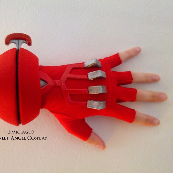 - Il guanto mi ha fatto dannare parecchio e lo ho rifatto 3 volte con 3 materiali diversi: alla fine ho optato per lycra rossa con dettagli in pvc e foam tutti rigorosamente in rilievo e non disegnati sul guanto.