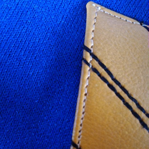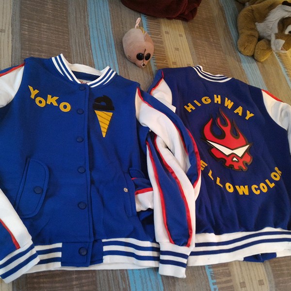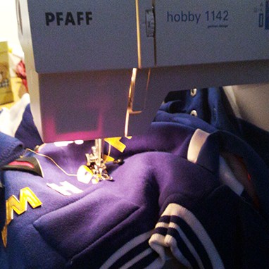 - I used a blue-white baseball jacket from a local shop, and I added all the details: skull, text, drill are in fake leather and I added the blue and red stripes on the sleeves